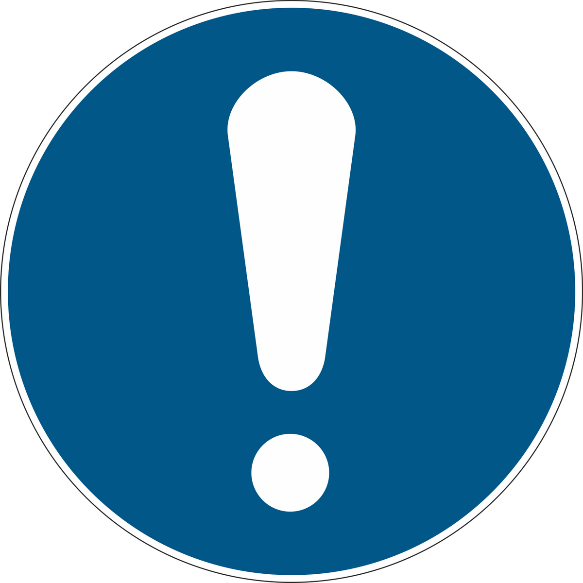 Der Sicherheitsaufkleber, Allgemeines Gebotszeichen, ist permanent haftend und kann sowohl für Innen- oder Außenbereiche verwendet werden. Die Verklebung kann auf allen fettfreien, staubfreien und glatten Flächen erfolgen.