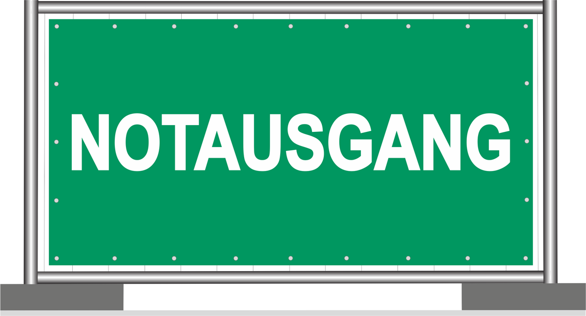 Bauzaunbanner grundfarbig Grün mit weißer Aufschrift Notausgang