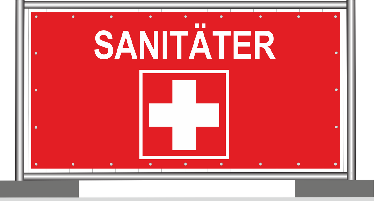 Hinweisbanner passend für Bauzäune in der Signalfarbe Rot mit Piktogramm und Text Sanitäter