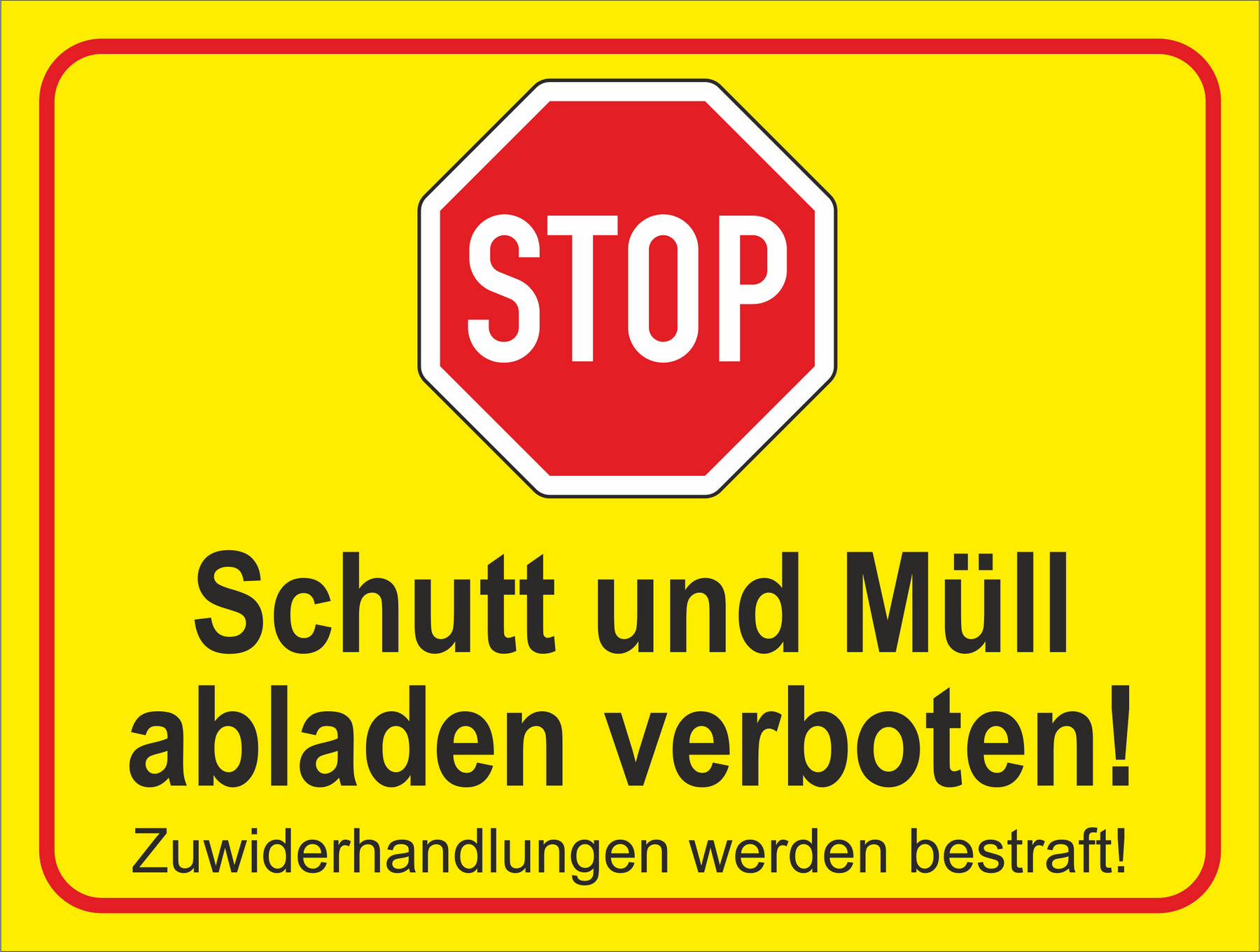 Gelbes Verbotsschild mit rotem STOP Zeichen und Text  Müll und Schutt abladen verboten