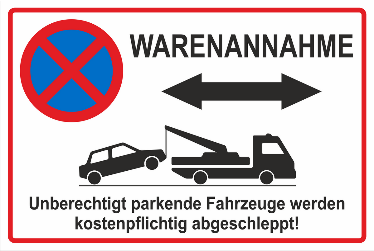 Parkverbotsschild "Warenannahme Unberechtigt parkende Fahrzeuge werden kostenpflichtig abgeschleppt"
