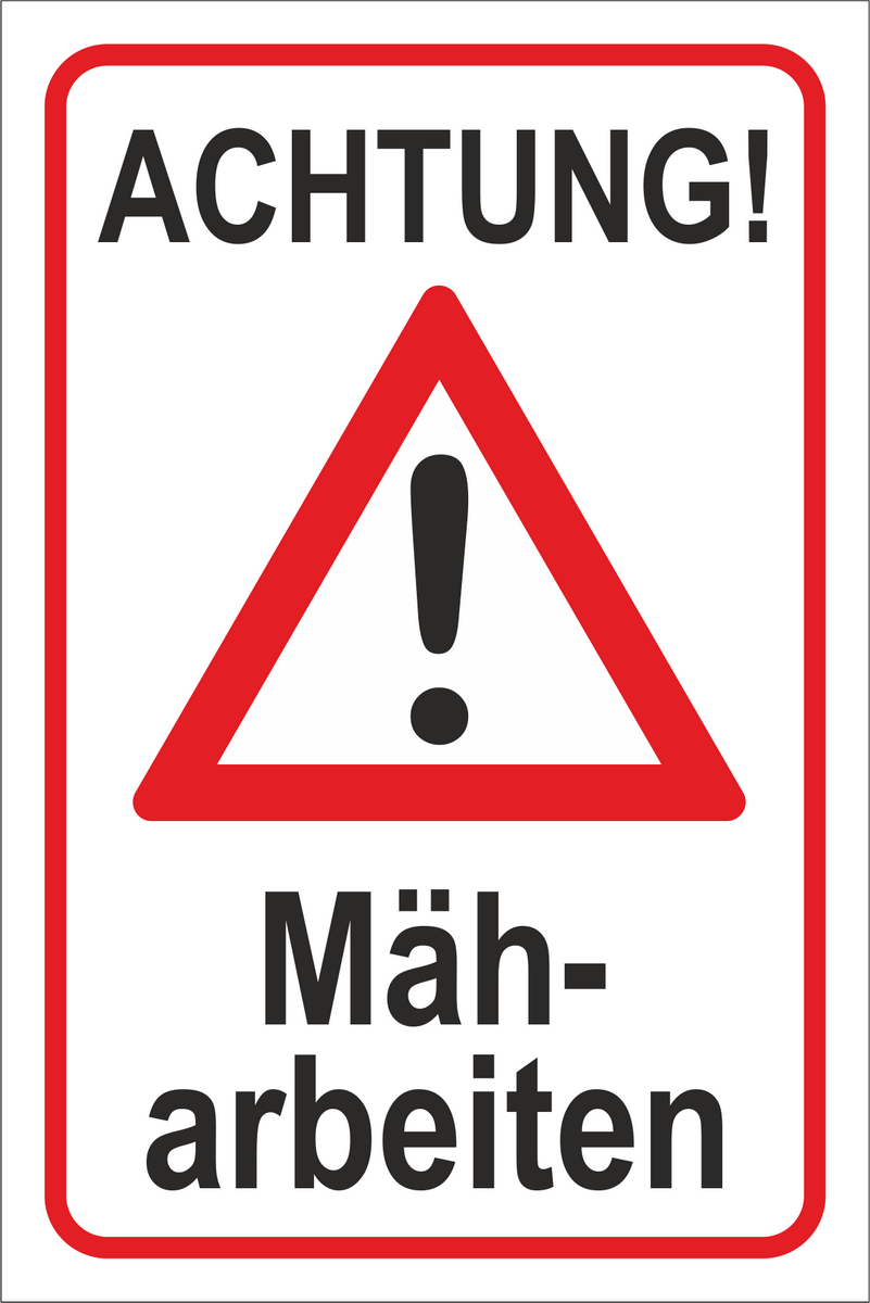 Warnschild Weiß mit rotem Warnzeichen und Text Achtung Mäharbeiten