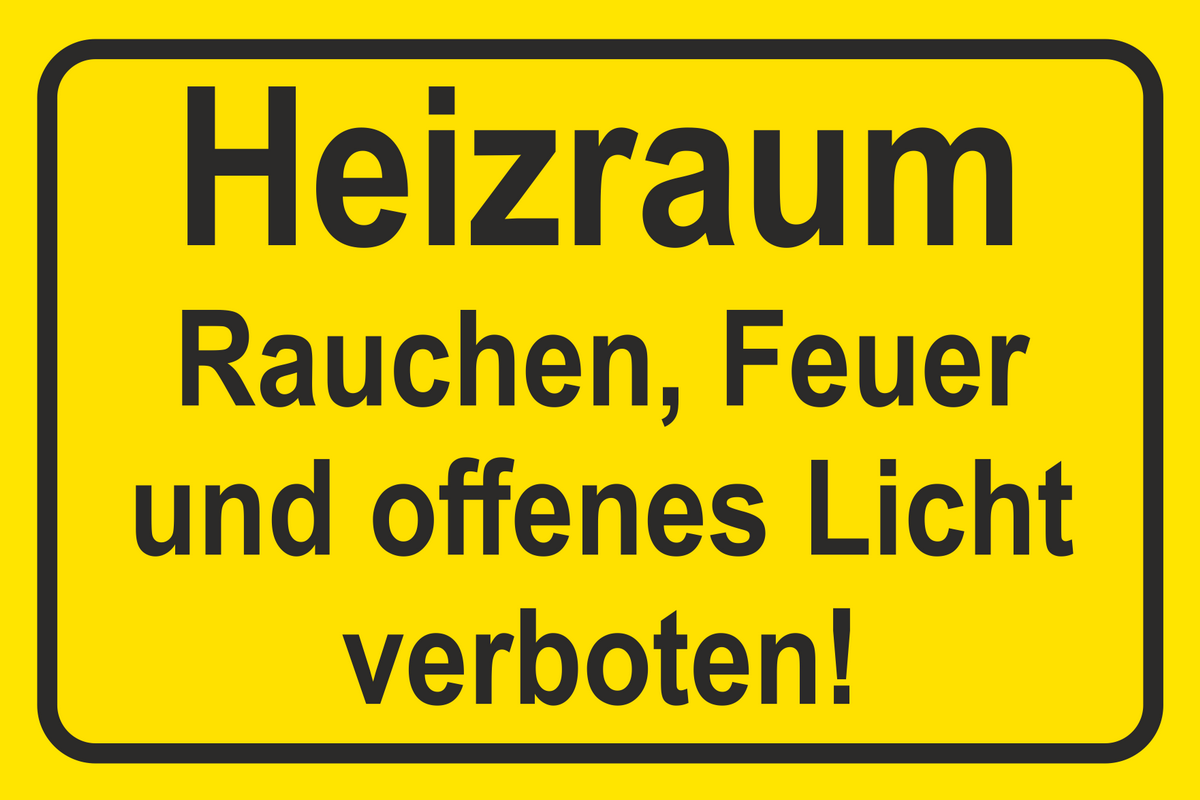 Warnschild Querformat Gelb mit Text Heizraum, Rauchen Feuer und offenes Licht verboten